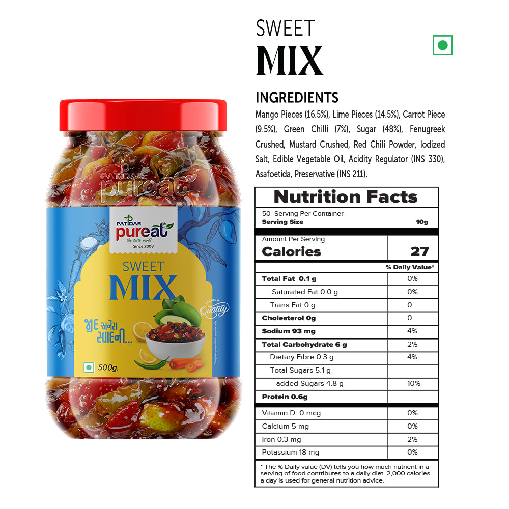 Mango Pieces (16.5%), Lime Pieces (14.5%), Carrot Piece (9.5%), Green Chilli (7%), Sugar (48%), Fenugreek Crushed, Mustard Crushed, Red Chili Powder, Iodized Salt, Edible Vegetable Oil, Acidity Regulator (INS 330), Asafoetida, Preservative (INS 211).